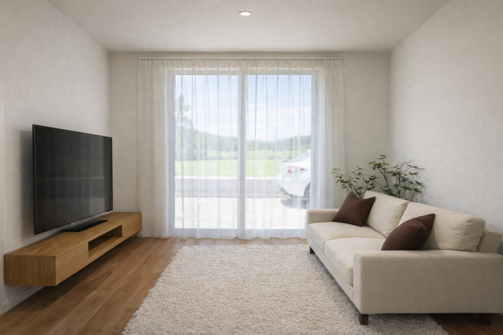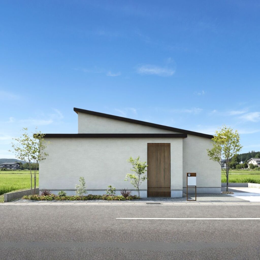 大きな開口部からたっぷりの光が入り込む、明るく心地よい大空間。白を基調とした内装と高い天井が、平屋ならではのゆったりとした開放感を演出します。自然光に包まれながら、穏やかな時間を過ごせる住まいです。 ※完成イメージ画像