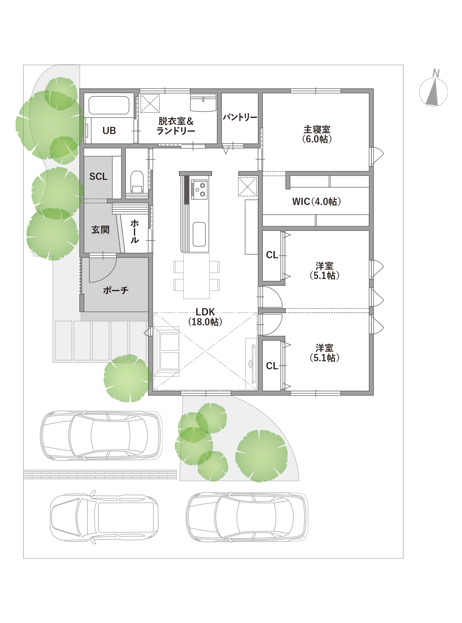 勾配天井がもたらす高さのゆとりと、壁一面の大きな窓から差し込む柔らかな光。日中は照明いらずの明るさがLDKの隅々まで広がり、室内と外が心地よくつながります。平屋ならではの贅沢な開放感を凝縮した設計です。 ※完成イメージ画像