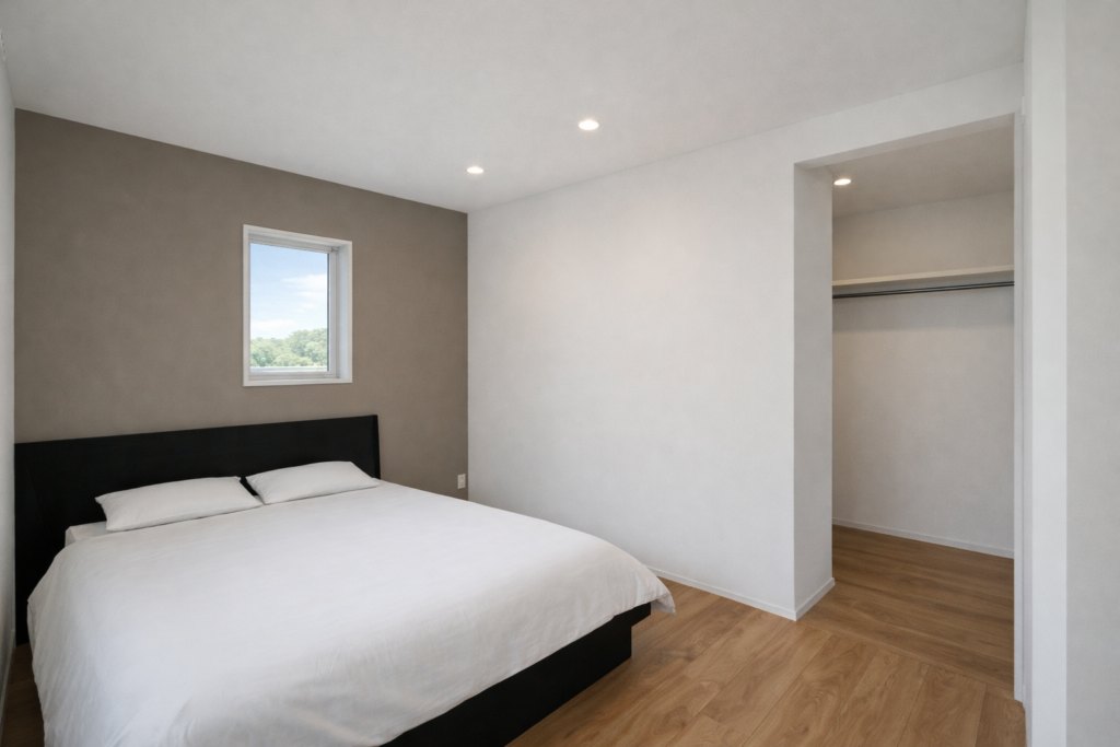 心地よい光が差し込む、広々とした主寝室。落ち着いたアクセントクロスが癒やしの空間を演出します。奥には大容量のウォークインクローゼットを完備し、収納力と機能的な動線を両立。平屋ならではのゆとりあるプライベート空間です。 ※完成イメージ画像