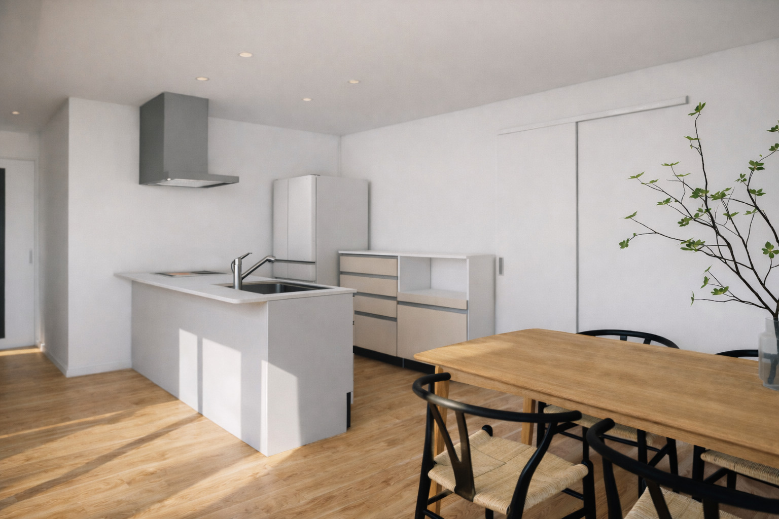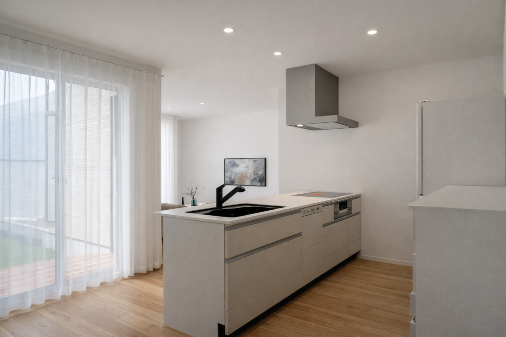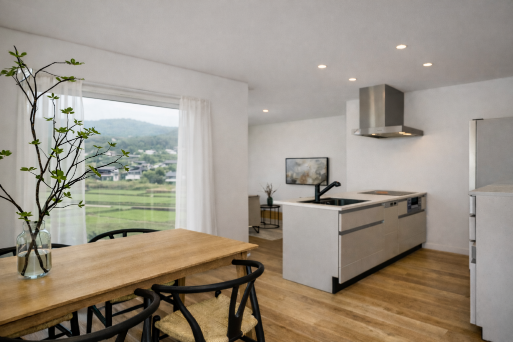 キッチンとダイニングを横並びにしたことで、配膳や片付けが驚くほどスムーズに。 料理をしながらリビング全体が見渡せる、安心の設計です。 ※完成イメージ画像