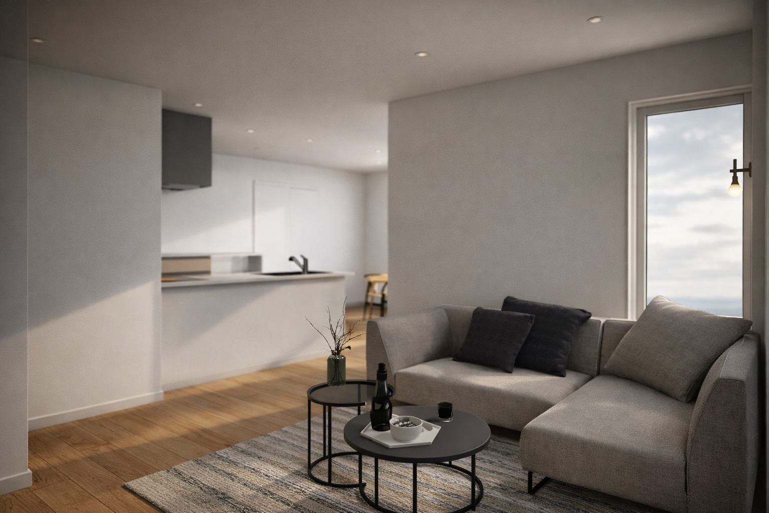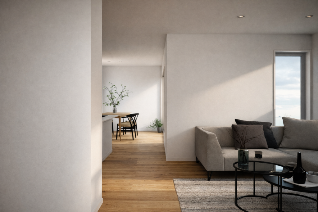 ダイニングとリビングをL字型に配置。 空間を緩やかに分けることで、家族が同じ場所にいながら、それぞれの時間も大切に過ごせる工夫が詰まっています。 ※完成イメージ画像