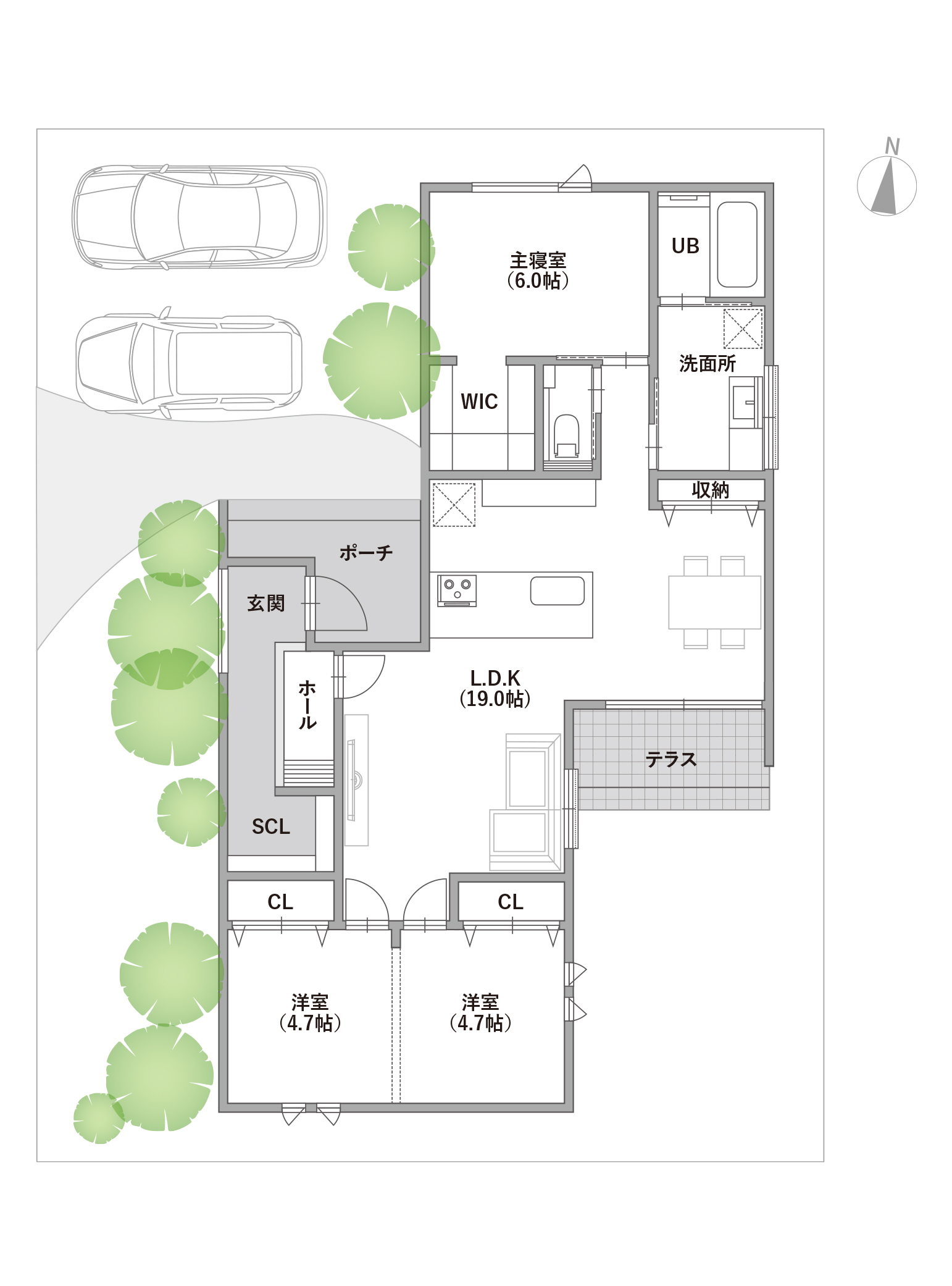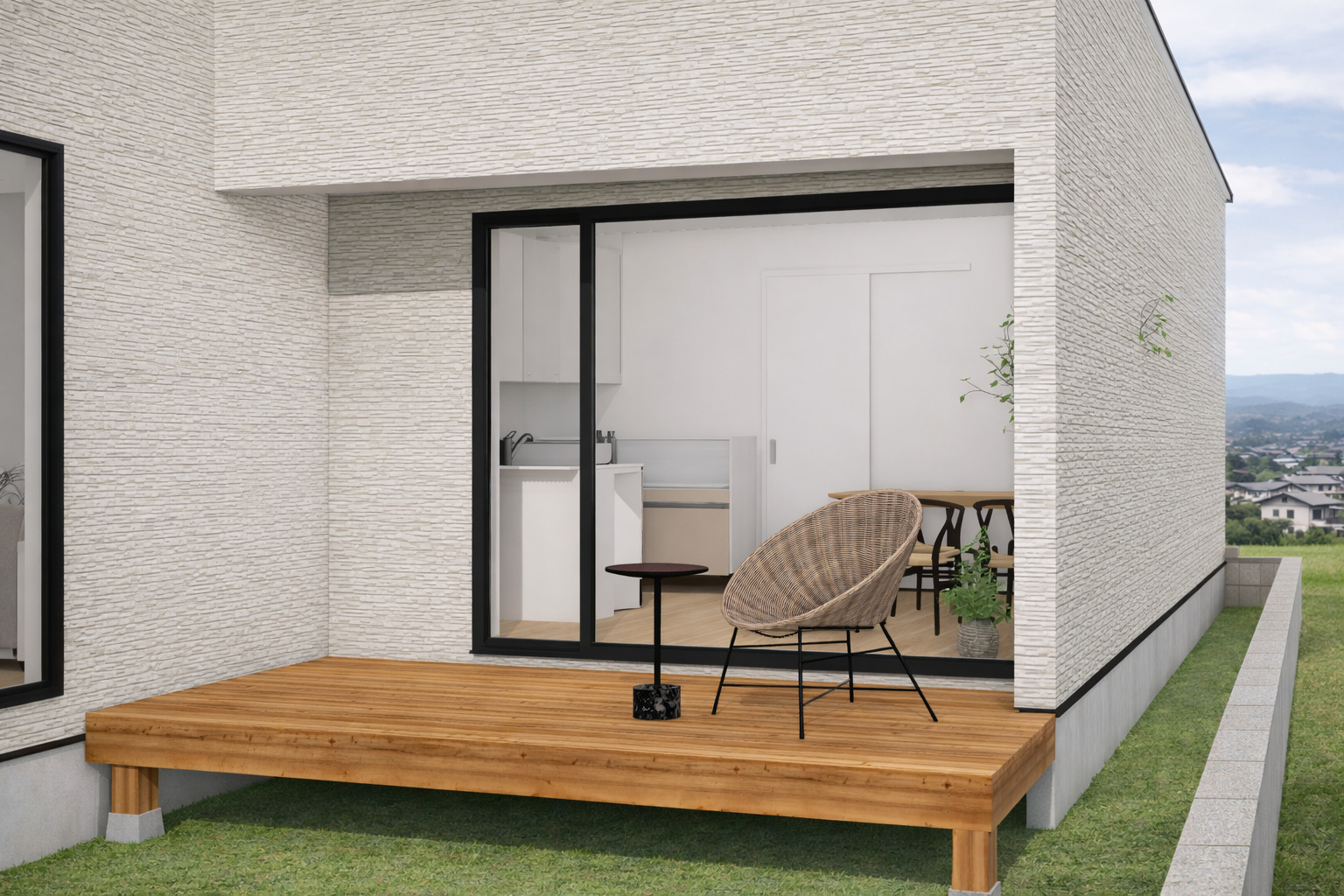 建物のL字部分にテラスを配置することで、外からの視線を遮る落ち着いた空間に。 カーテンを開けて、内と外が心地よく繋がる暮らしを楽しめます。 ※完成イメージ画像