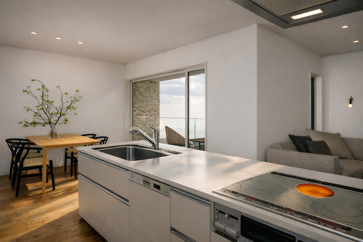 お料理中も会話が弾む横並びのダイニング、そしてL字の角に抱かれたプライベートテラス。