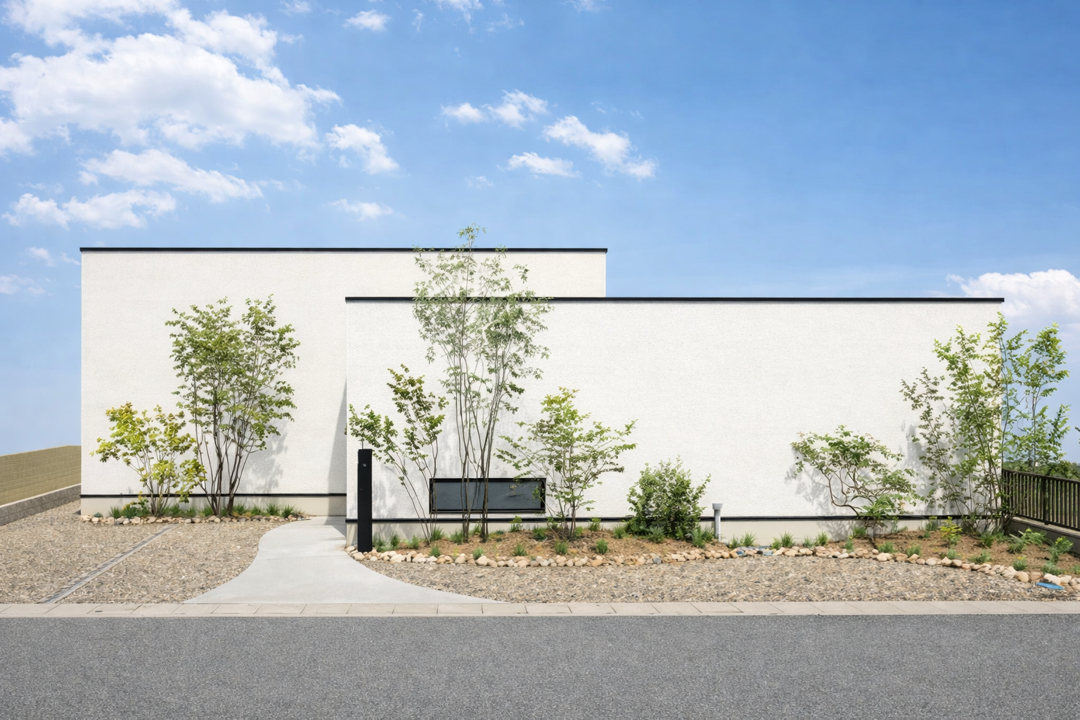 清潔感あふれる白い外壁とシャープな屋根ライン。街並みに溶け込みながらも、一際目を引く洗練されたデザインです。 ※完成イメージ画像